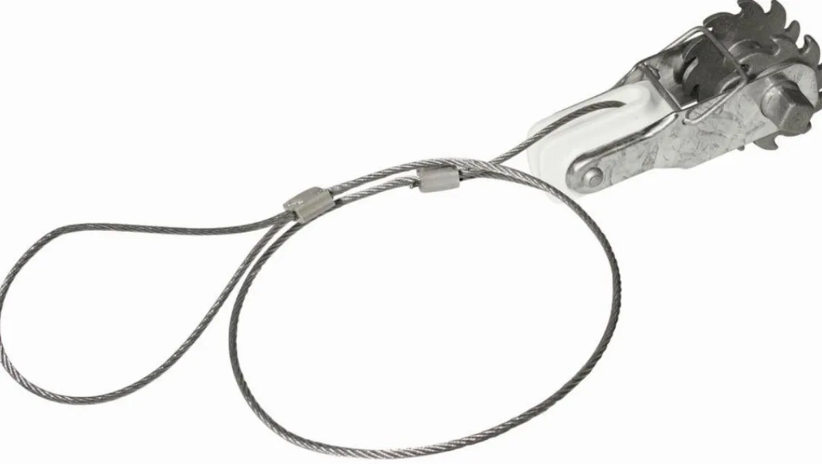 Tendeur cranté avec isolateur intégré et câble de fixation pour une tension et une détention rapide.