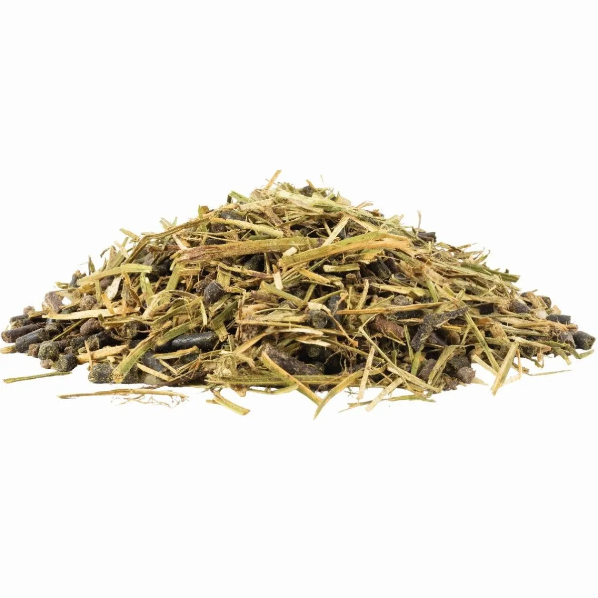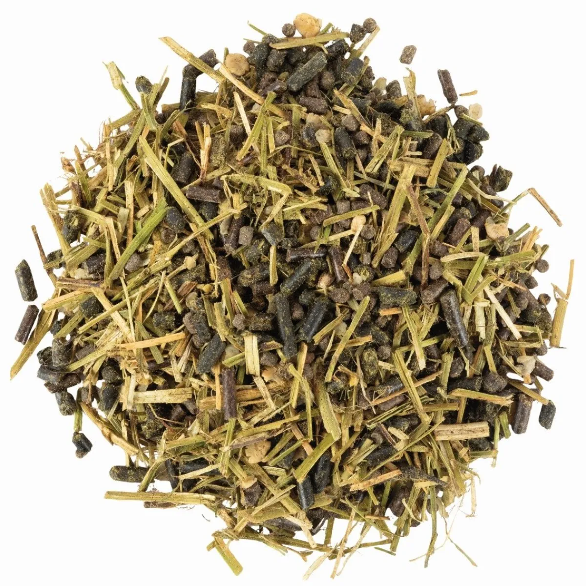 Luzerne, son de riz, fléole, soja toasté, pailette de lin, tourteau de colza, pulpe de betterave, huile de graine de lin, remoulage de blé, drèche de maïs, mélasse d’isomaltulose, huile de colza, tourteau de pression de graine de lin, racines de chicorée, produits dérivés de levures, chlorure de sodium, graine de lin, bicarbonate de sodium, carbonate de calcum, protéines de pommes de terre, fibre de chicorée, huile de coprah, maërl, pulpe de chicorée séchée, pois, phosphate de magnésium, caroube, feuilles séchées (orties), oxyde de magnésium, propylèneglycol, sulfate de sodium, soluble de pépins de raisin, solubles d’oignons.