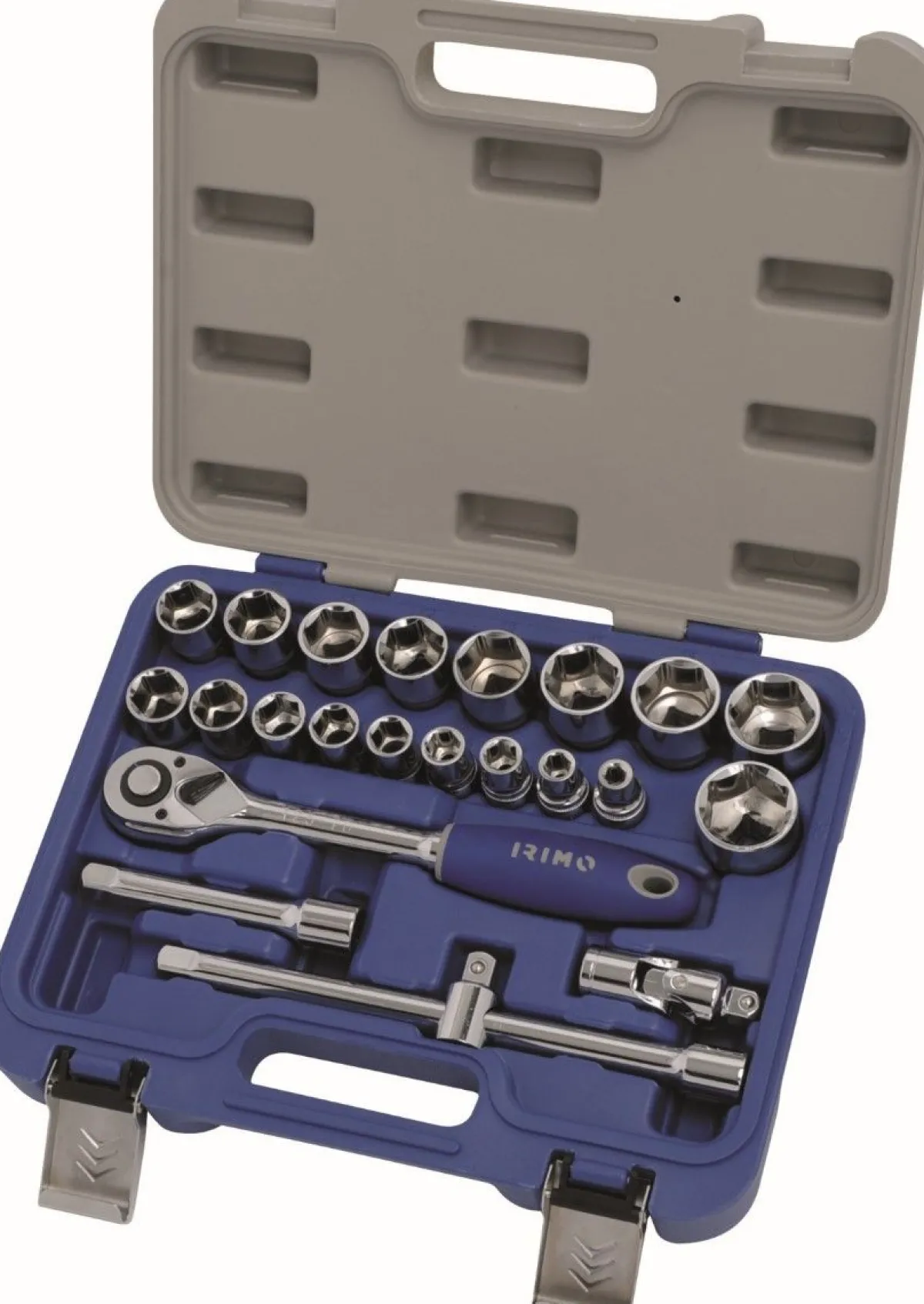 – 18 douilles 6 pans en acier allié au chrome vanadium avec finition chromée et brillante ; 8, 10, 12, 13, 14, 16, 17, 19, 20, 21, 22, 23, 24, 26, 27, 28, 30, 32mm