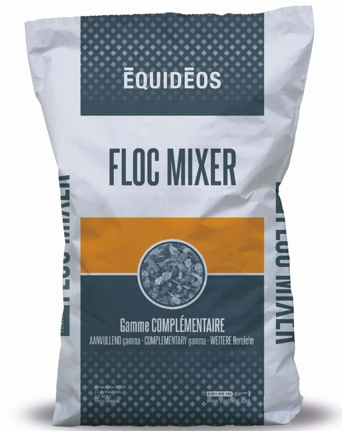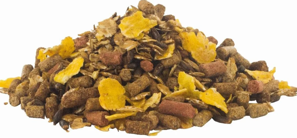 remoulage de blé, tourteau de colza, luzerne, flocons d’orge, drèche de maïs, soja toasté, avoine, flocons de maïs, cosses d’avoine, maïs, mélasse d’isomaltulose, graine de lin, pulpe de betterave, pellicules de féveroles, carbonate de calcium, orge, chlorure de sodium, pois, blé poppé, orge poppé, maïs poppé, huile de colza, oxyde de magnésium, bicarbonate de sodium, amidon de pomme de terre, phosphate monocalcique, racines de chicorée, propylèneglycol, sulfate de sodium.