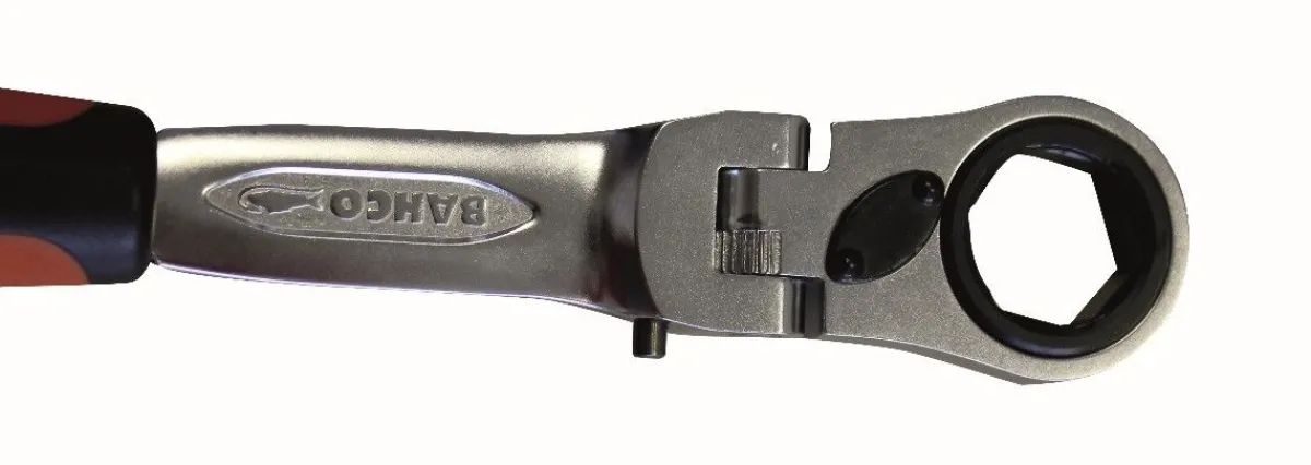 Clé à cliquet à tête flexible traversante multiposition ergonomique.