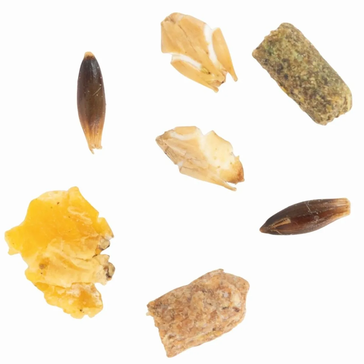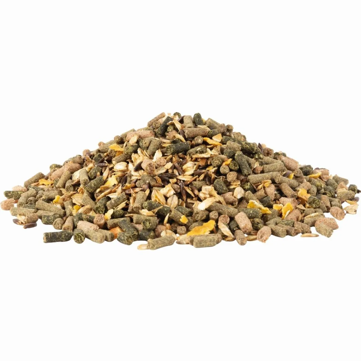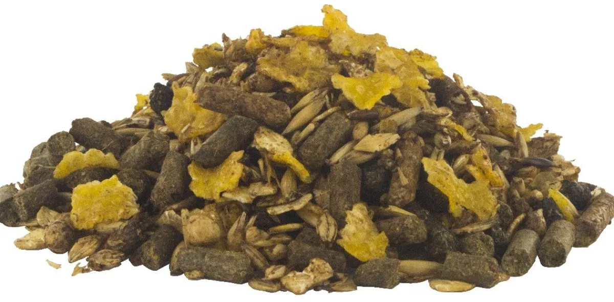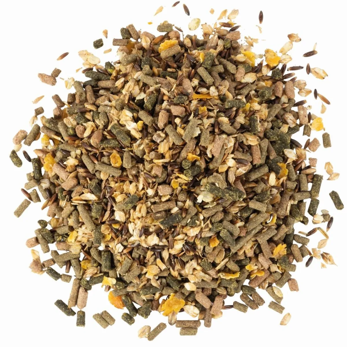 Avoine, flocons d’orge, luzerne, remoulage de blé, son de blé, flocons de maïs, drèche de maïs, tourteau de graine de colza, balles d’épeautre, mélasse d’isomaltulose, orge, huile de colza, maïs, coques de pois, carbonate de calcium, chlorure de sodium, bicarbonate de sodium, cosses d’avoine, graine de lin, oxyde de magnésium, racines de chicorée, maërl, produits dérivées de levures, mélasse de betterave, soluble de pépins de raisin, soluble d’oignon.