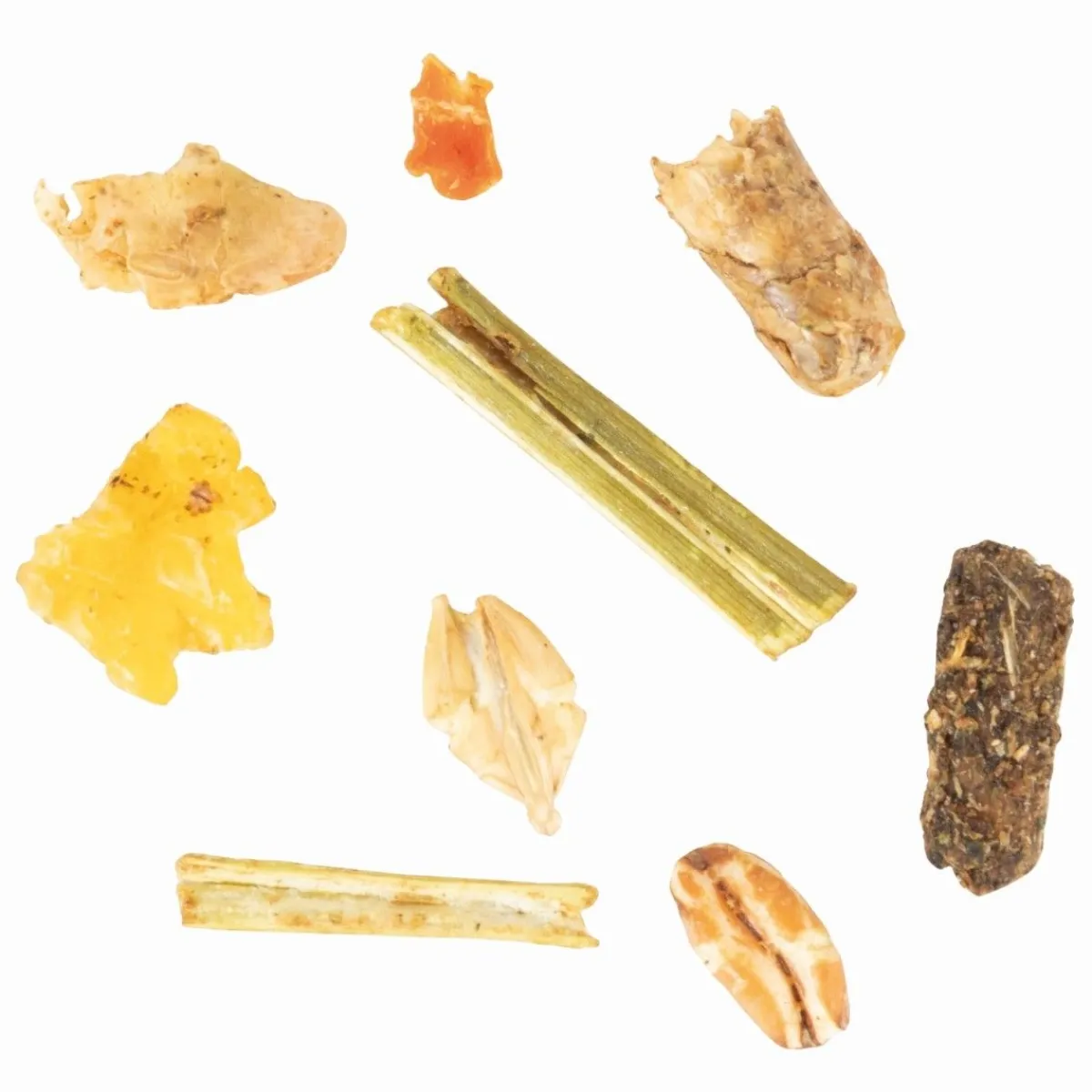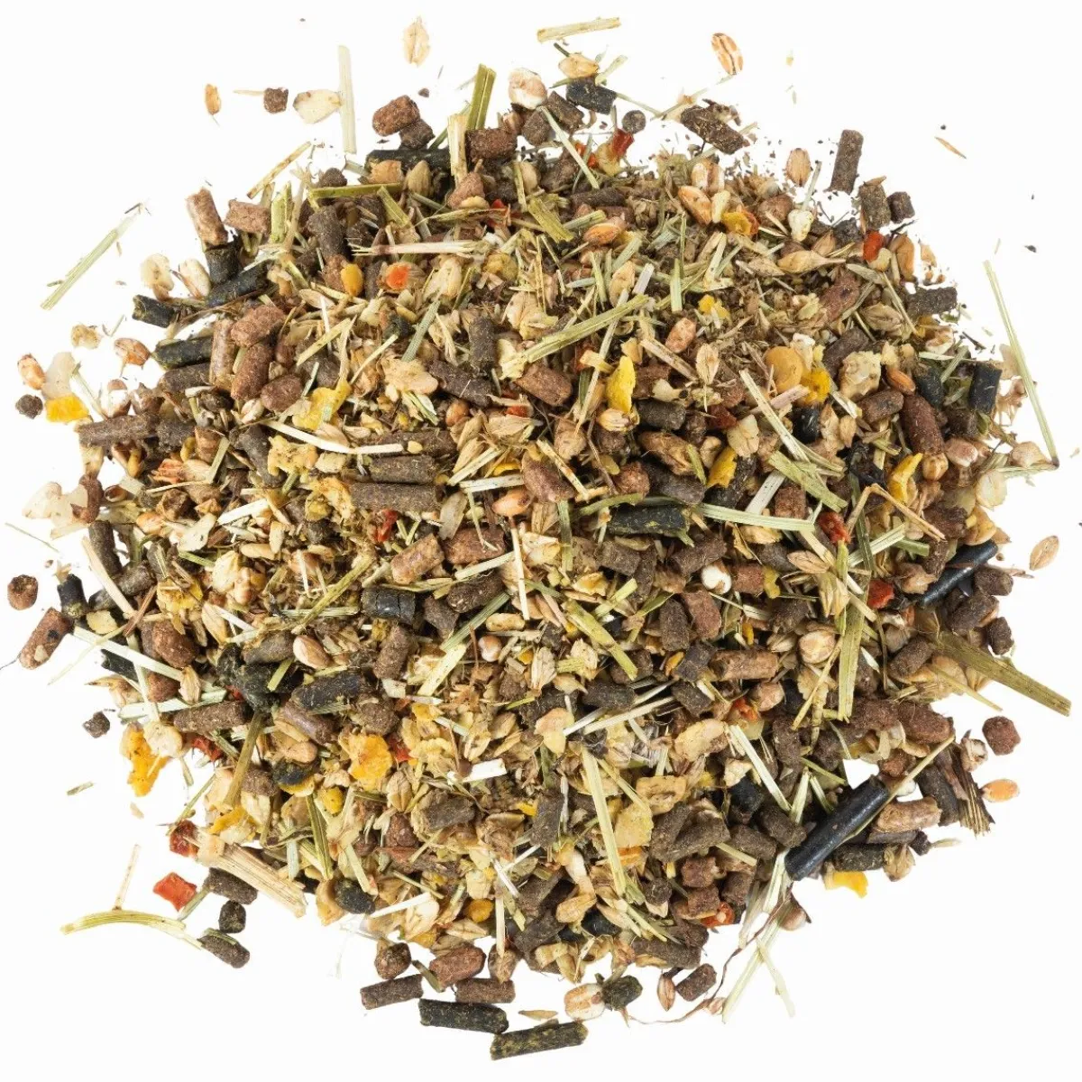 Remoulage de blé, luzerne, flocons d’orge, cosses d’avoine, tourteau de colza, flocons de maïs, soja toasté, drèche de maïs, fléole, pellicules de féveroles, huile de colza, orge, mélasse d’isomaltulose, huile de graine de lin, maïs, carbonate de calcium, mélasse de canne à sucre, flocons de carottes, blé poppé, orge poppé, maïs poppé, chlorure de sodium, graine de lin, bicarbonate de sodium, racines de chicorée, oxyde de magnésium, phosphate monocalcique, maërl, produits dérivés de levures, mélasse de betterave, proprylèneglycol, sulfate de sodium, solubles de pépins de raisins, solubles d’oignons.